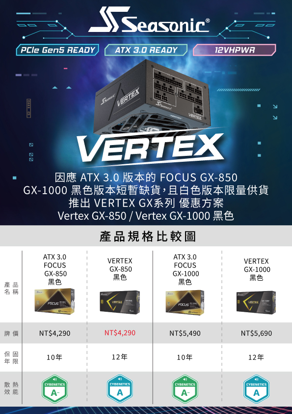 「消息2」. 台灣海韻與總代理杰強國際當然要讓各位玩家持續支持選購海韻POWER的機會,因此讓更高階的VERTEX GX-850原本$5490價格,用無痛升級的優惠活動價$4290來暫時取代ATX 3.0 FOCUS GX-850,且保固也多了2年,不僅如此,Vertex系列用料品質與供電穩定性更優勝於ATX 3.0 FOCUS系列!