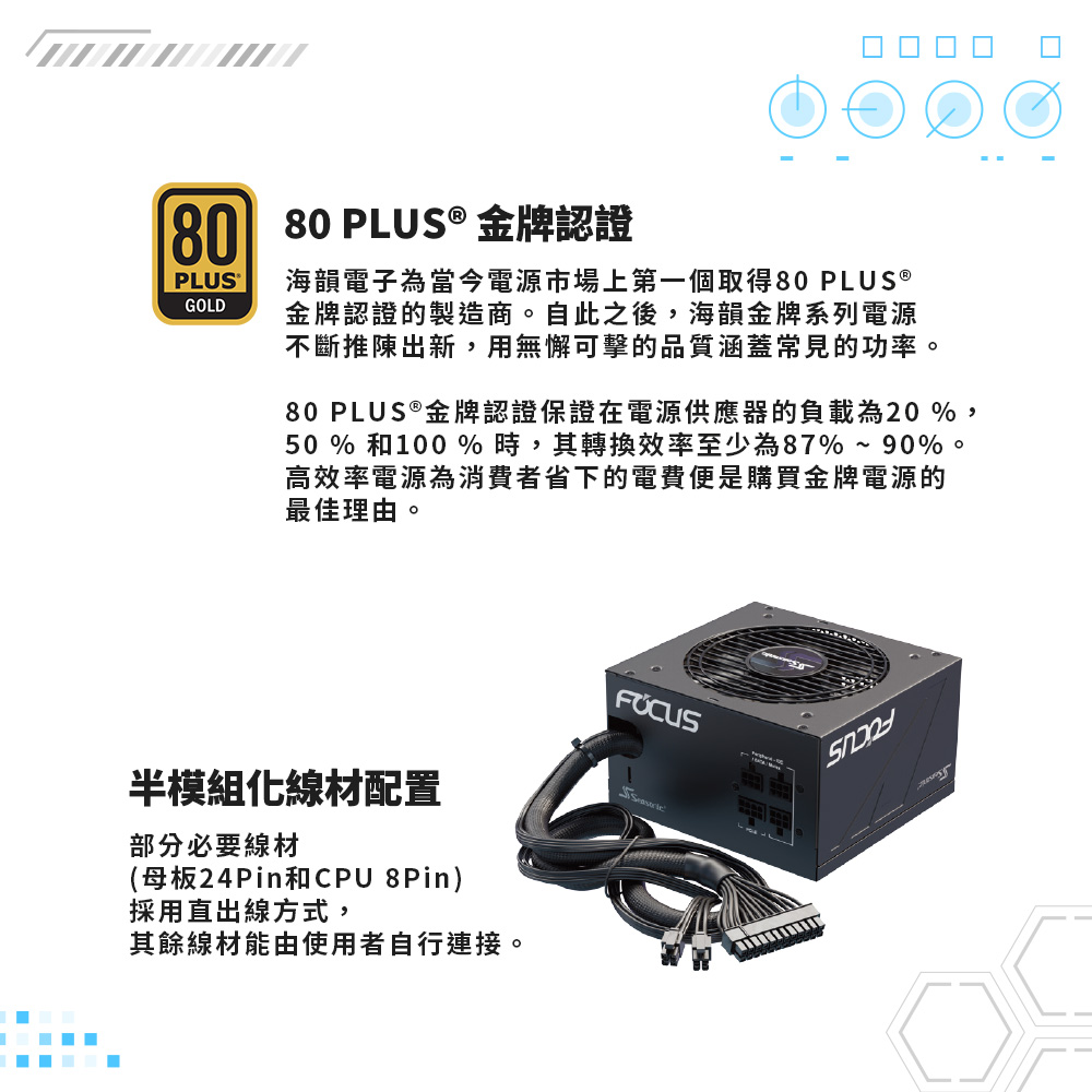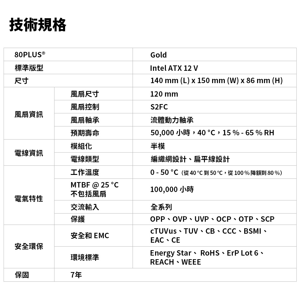 支援多媒體高階顯示卡 ; 半模組化線材配置 ; 7年原廠保固 ; 卓越的輸出電壓管控 ; 鍍金高電流端子 ; 80 PLUS 金牌認證