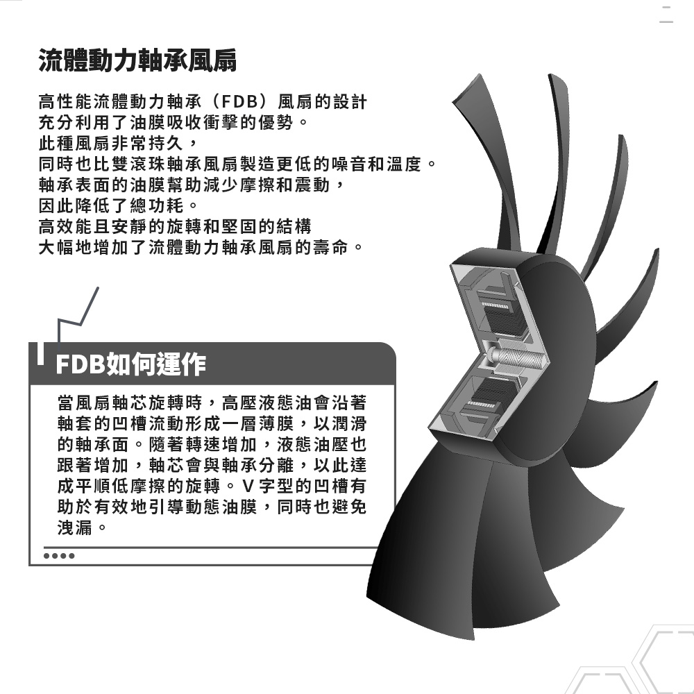高性能流體動力軸承(FDB)風扇的設計充分利用了油膜吸收衝擊的優勢。此種風扇非常持久,同時也比雙滾珠軸承風扇製造更低的噪音和溫度。軸承表面的油膜幫助減少摩擦和震動,因此降低了總功耗。高效能且安靜的旋轉和堅固的結構大幅地增加了流體動力軸承風扇的壽命。