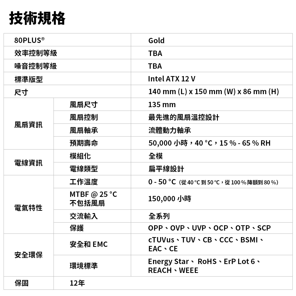 ★ 獲得80 PLUS Gold 認證,擁有超高效率 ★ 直流對直流轉換設計 ★ 海韻專利Hybrid Silent Fan Control靜音設計 ★ 135毫米動態液壓軸承風扇 ★ 高傳導鋁質固態電容 ★ 高可靠度105°C日系鋁質電解電容 ★ 微差負載調節 (MTLR) ★ 主動式功率因素校正[PF值達99%] ★ 支援充足的+12V輸出 ★ 鍍金高電流端子 (MB,CPU & PCIe) ★ 雙面板設計 ★ 支援多媒體高階顯示卡 ★ 全球通用全域電壓 ★ 十二年保固