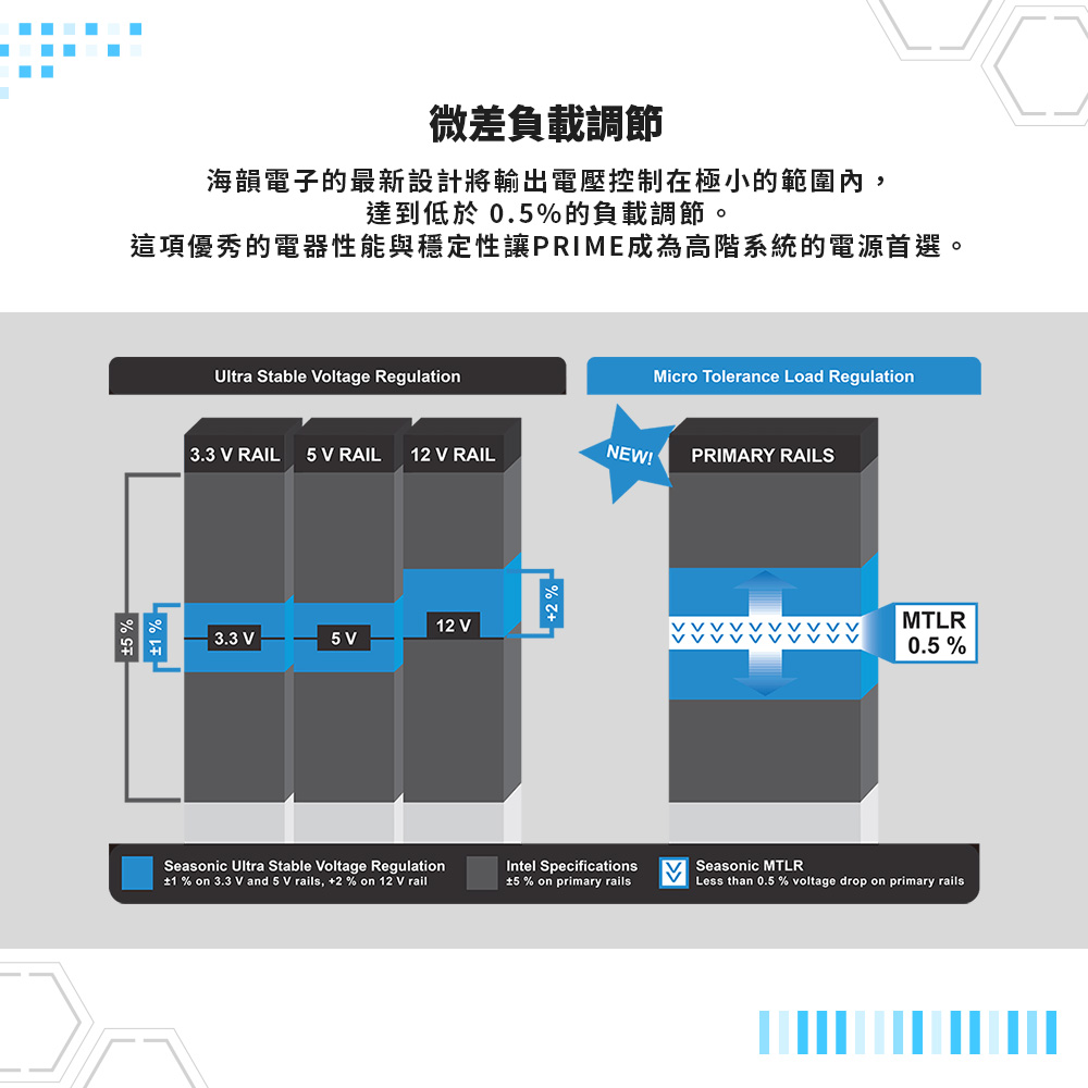 海韻 PRIME 1000W Gold 電源供應器包括優質零件,表現出色。80Plus Gold認證與海韻嚴格的微公差負載調節配合,為用戶提供高品質的電力輸出。海韻的工程師們開發了無線連接設計,其中高導電銅板取代了傳統使用的各個電纜,以實現更清潔的設計和更好的功率效率。完全模組化的電纜連接提供了一個靈活的解決方案,用於優化電線管理,以減少系統內部的線材混亂和增加內部空氣對流。