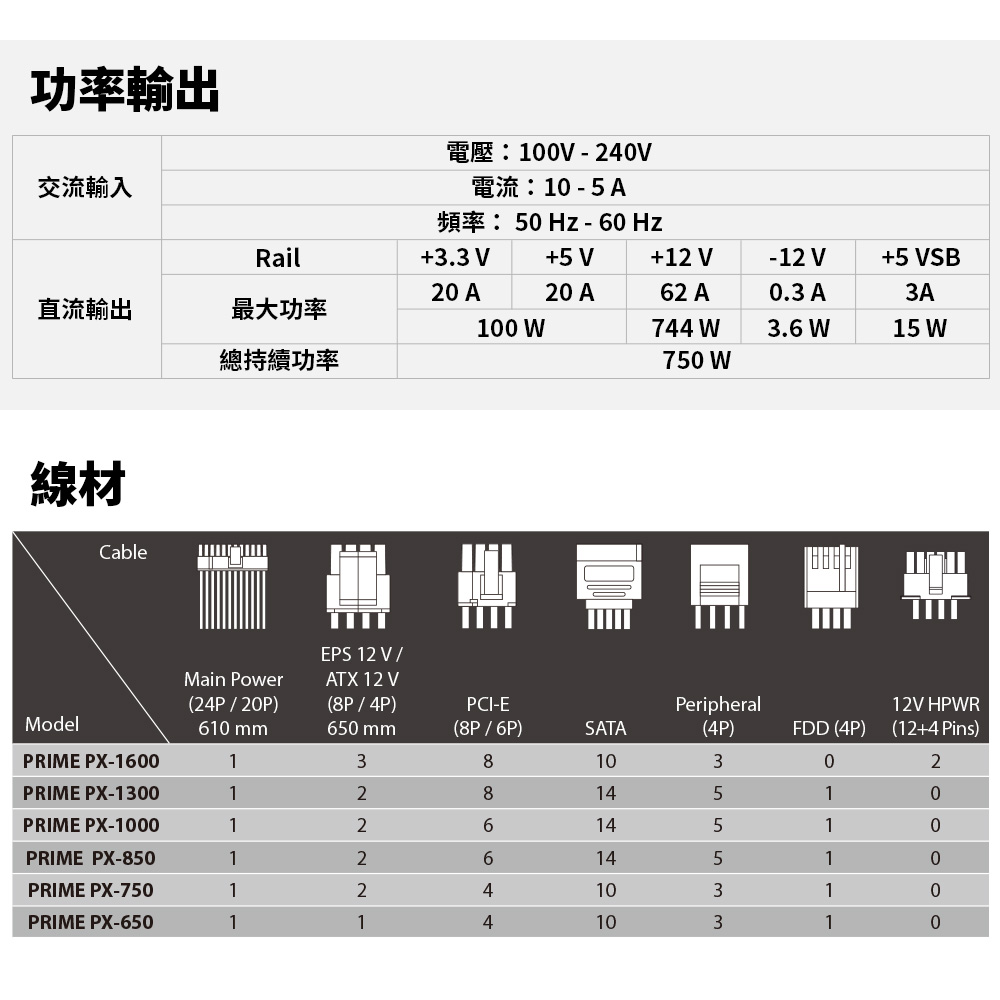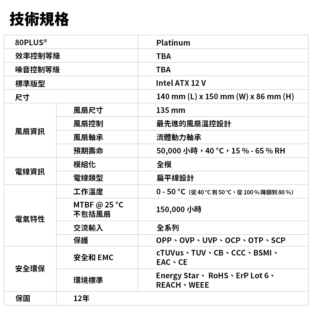 特色 ★ 獲得80 PLUS® Platinum 認證,擁有超高效率 ★ 直流對直流轉換設計 ★ 海韻專利Hybrid Silent Fan Control靜音設計 ★ 135毫米動態液壓軸承風扇 ★ 高傳導鋁質固態電容 ★ 高可靠度105°C日系鋁質電解電容 ★ 微差負載調節 (MTLR) ★ 主動式功率因素校正[PF值達99%] ★ 支援充足的+12V輸出 ★ 鍍金高電流端子 (MB, CPU & PCIe) ★ 雙面板設計 ★ 支援多媒體高階顯示卡 ★ 全球通用全域電壓 ★ 十二年保固