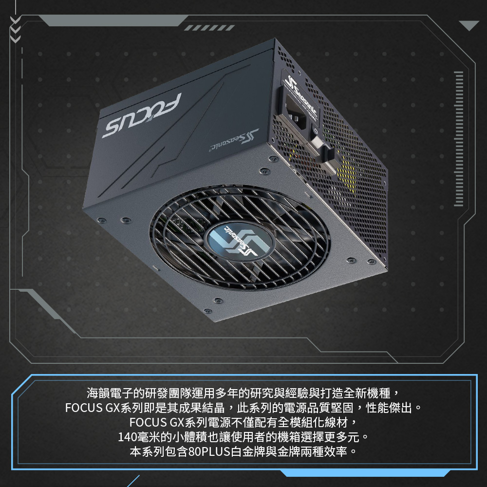 海韻電子的研發團隊運用多年的研究與經驗與打造全新機種,FOCUS GX系列即是其成果結晶,此系列的電源品質堅固,性能傑出。FOCUS GX系列電源不僅配有全模組化線材,140毫米的小體積也讓使用者的機箱選擇更多元。本系列包含80PLUS白金牌與金牌兩種效率。
