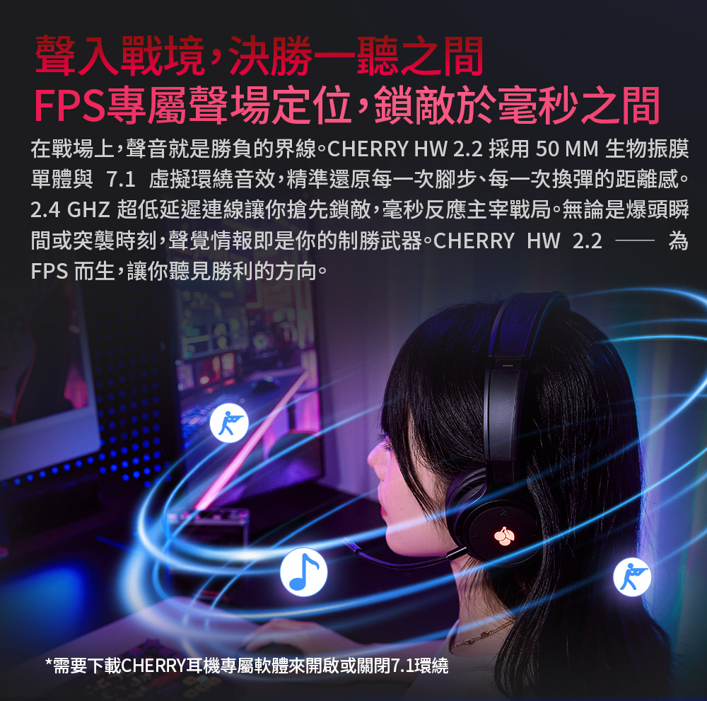 不管是在激烈槍戰中精準判斷敵人方位,還是在靜謐夜晚沉浸聆聽音樂 — Cherry HW 2.2 FPS專用電競耳機 都讓你像戴上了一座小型錄音室。這是一款不只為電競打造,也為音樂靈魂加值的全能耳機。