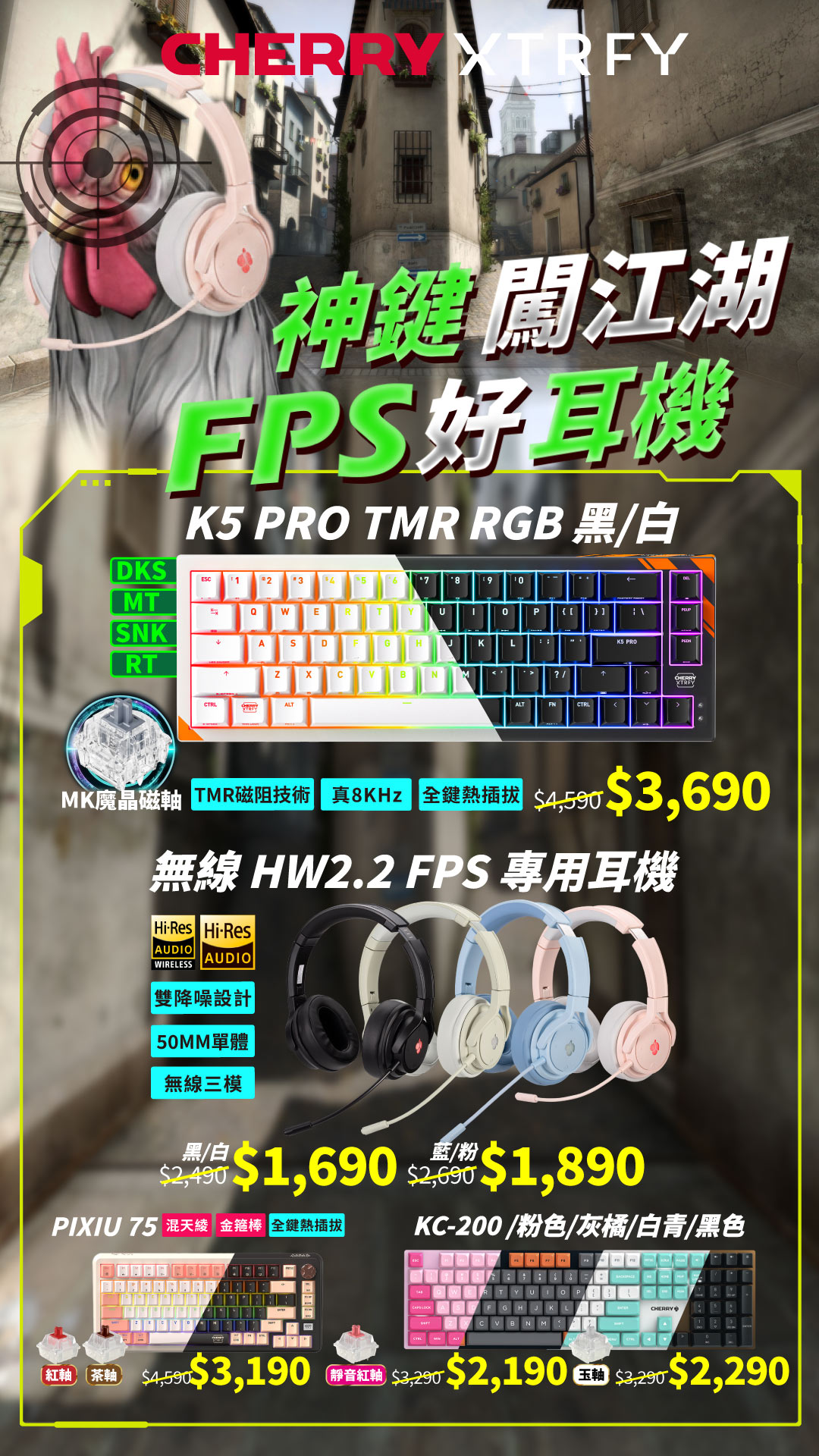 除了 FPS 專武 K5 PRO TMR 與 HW 2.2 FPS專用電競耳機震撼登場外,本次 12 月活動也同步推出 CHERRY 全系列機械電競鍵盤限時優惠。無論你偏好經典段落、極速線性,都能一次體驗、一次入手。